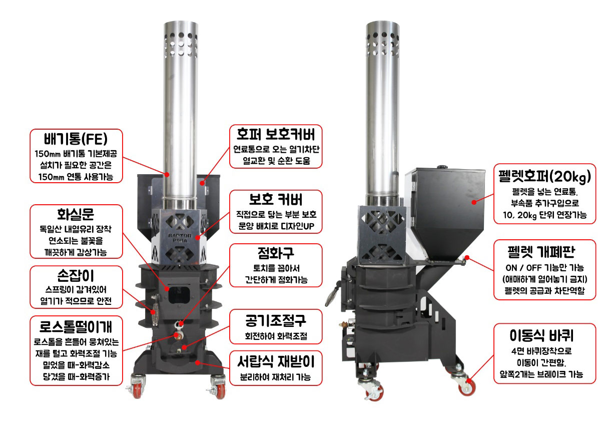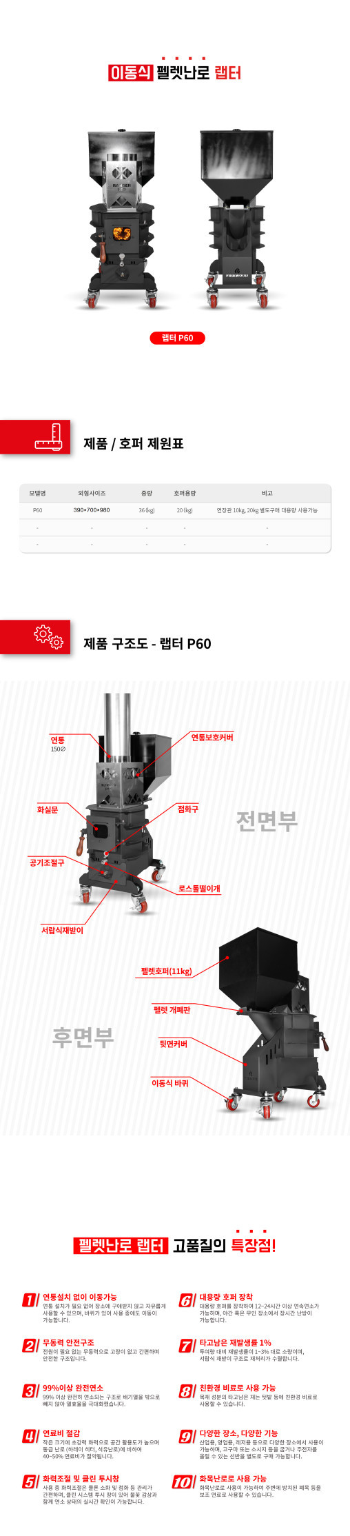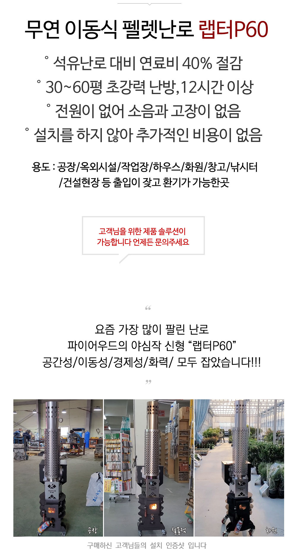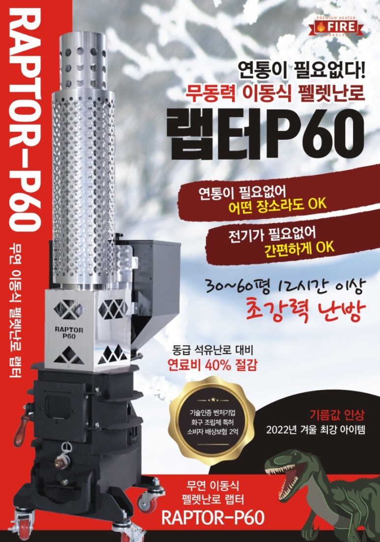 파이어우드 이동식 펠렛난로 랩터P60 / 석유난로대비 연료비40% 절감 / 초강력30~60평 난방 12시간 이상 / 전원이 없…