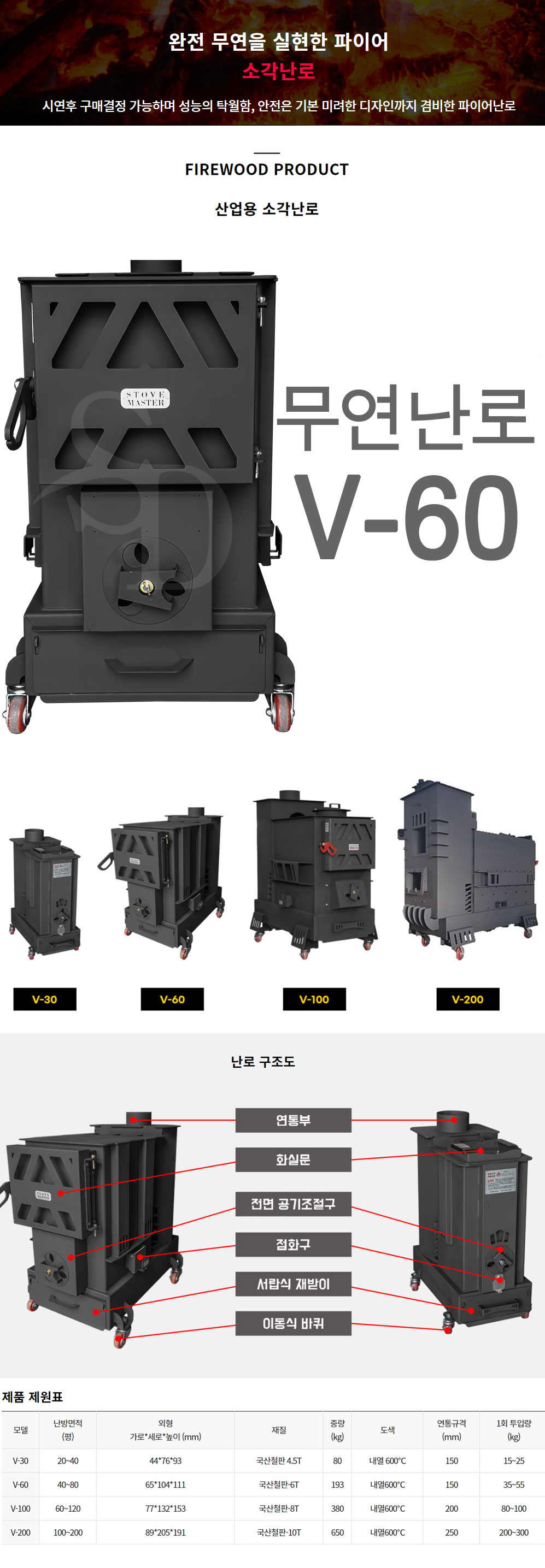 파이어 우드 V-60 무연난로 농막 펜션 싱크대공장 가구공장 고물상 난로 산업용 업소용 소각난로